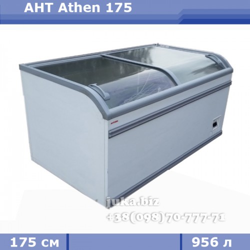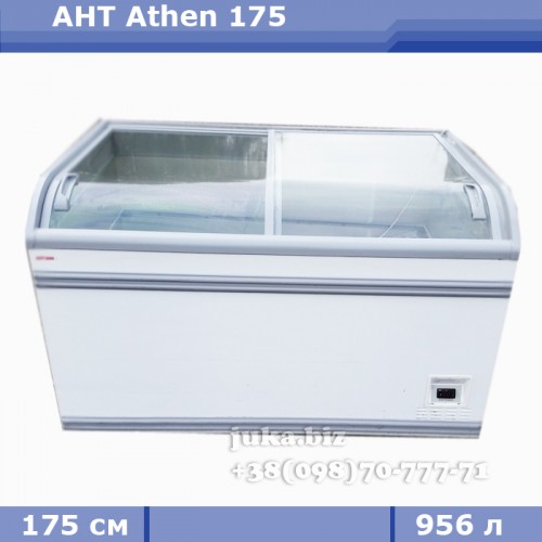 Морозильний лар б/в AHT Athen 175. ДхВхГ: 1752ммх994ммх910мм; Об'єм 956 л; Площа викладки 1,22 м2; вага: 125 кг; Споживання при 25°С: 8.5 КВт/24год; роб.температури -18/-23°С, зовнішні температури: +16/+25°С. Компресор Danfoss (Данія).